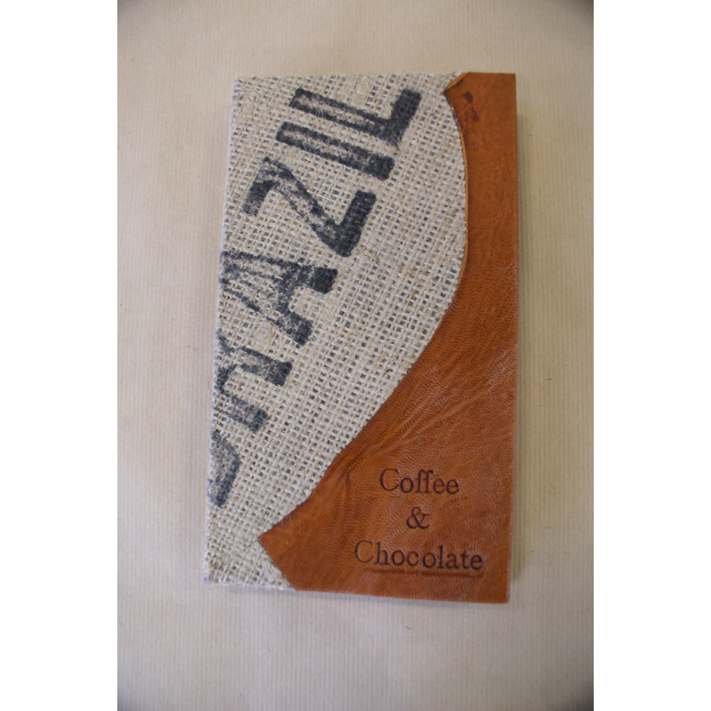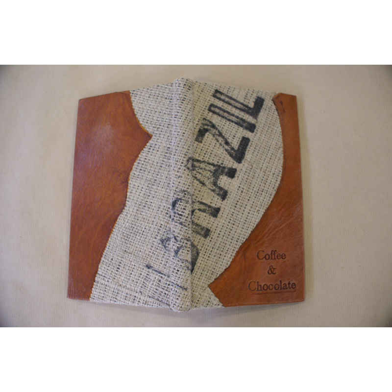 Libro rilegato a mano con copertina di sacco da caffè originale e intarsi in pelle con stampa a caldo.